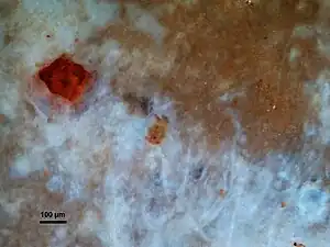 The formation of a biofilm begins with the attachment of free-floating microorganisms to a surface.[9][6] The first colonist bacteria of a biofilm may adhere to the surface initially by the weak van der Waals forces and hydrophobic effects.[16][17] If the colonists are not immediately separated from the surface, they can anchor themselves more permanently using cell adhesion structures such as pili. A unique group of Archaea that inhabit anoxic groundwater have similar structures called hami. Each hamus is a long tube with three hook attachments that are used to attach to each other or to a surface, enabling a community to develop.[18][19] Hyperthermophilic archaeon Pyrobaculum calidifontis produce bundling pili which are homologous to the bacterial TasA filaments, a major component of the extracellular matrix in bacterial biofilms, which contribute to biofilm stability.[20] TasA homologs are encoded by many other archaea, suggesting mechanistic similarities and evolutionary connection between bacterial and archaeal biofilms.[20]