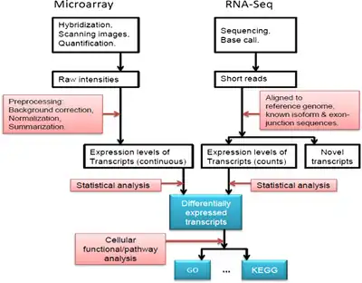 The expression of many genes can be determined by measuring mRNA levels with multiple techniques including microarrays, expressed cDNA sequence tag (EST) sequencing, serial analysis of gene expression (SAGE) tag sequencing, massively parallel signature sequencing (MPSS), RNA-Seq, also known as "Whole Transcriptome Shotgun Sequencing" (WTSS), or various applications of multiplexed in-situ hybridization. All of these techniques are extremely noise-prone and/or subject to bias in the biological measurement, and a major research area in computational biology involves developing statistical tools to separate signal from noise in high-throughput gene expression studies.[49] Such studies are often used to determine the genes implicated in a disorder: one might compare microarray data from cancerous epithelial cells to data from non-cancerous cells to determine the transcripts that are up-regulated and down-regulated in a particular population of cancer cells.