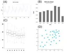Figure A: Line graph example. The birth rate in Brazil (2010–2016);[9] Figure B: Bar chart example. The birth rate in Brazil for the December months from 2010 to 2016; Figure C: Example of Box Plot: number of glycines in the proteome of eight different organisms (A-H); Figure D: Example of a scatter plot.