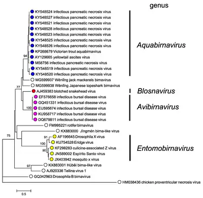 Birnaviridae is a family of double-stranded RNA viruses.[1] Salmonid fish, birds and insects serve as natural hosts. There are currently 11 species in this family, divided among seven genera.[2] Diseases associated with this family include infectious pancreatic necrosis in salmonid fish, which causes significant losses to the aquaculture industry, with chronic infection in adult salmonid fish and acute viral disease in young salmonid fish.[2][3]