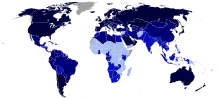 The average global birth rate was 18.1 births per 1,000 total population in 2021.[8] The death rate was 7.7 per 1,000. The RNI was thus 1.6 percent. In 2012 the average global birth rate was 19.611 according to the World Bank[9] and 19.15 births per 1,000 total population according to the CIA,[10] compared to 20.09 per 1,000 total population in 2007.[11]