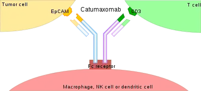 The binding of a BsAb to its target antigens can lead to a variety of effects. The most widely used application of this approach is in cancer immunotherapy, where BsAbs are engineered to simultaneously bind a cytotoxic cell and a target (a tumour cell) to be destroyed. It is possible to observe the bridging effect that BsAbs have on T cell/cancer cell interactions using label-free live cell imaging. Catumaxomab, one of the first trifunctional antibodies approved for therapeutic use, binds both CD3 on cytotoxic T cells and EpCAM on human adenocarcinomas.[11][12] The Fc region additionally binds to a cell that expresses Fc receptors, like a macrophage, natural killer cell or dendritic cell. Since the Fc region is still intact, this allows for the BsAb to trigger common immune responses when recognized by an Fc receptor, such as antibody-dependent cell-mediated cytotoxicity or complement-dependent cytotoxicity.[13][15]