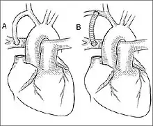 The Blalock–Thomas–Taussig shunt (commonly called the Blalock–Taussig shunt) is a heart operation used to increase blood flow to the lungs in some forms of congenital heart disease.[1] These conditions, in which a child is born with an abnormal heart include pulmonary atresia and Tetralogy of Fallot and are common causes of blue baby syndrome.[1]