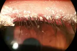 Staphylococcal blepharitis Archived 2018-03-04 at the Wayback Machine is caused by an infection of the anterior portion of the eyelid by Staphylococcal bacteria. In a study of ocular flora, 46% to 51% of those diagnosed with staphylococcal blepharitis had cultures positive for Staphylococcus aureus in comparison to 8% of normal patients.[3] Staphylococcal blepharitis may start in childhood and continue into adulthood.[18] It is commonly recurrent and it requires special medical care. The prevalence of Staphylococcus aureus in the conjunctival sac and on the lid margin varies among countries, likely due to differences in climate and environment.[19] Seborrheic blepharitis Archived 2018-03-04 at the Wayback Machine is characterized by less inflammation than Staphylococcal blepharitis; however, it causes more excess oil or greasy scaling. Meibomian gland dysfunction is a result of abnormalities of the meibomian glands and altered secretion of meibum, which plays an imperative role in lagging the evaporation of tear films and smoothing of the tear film to produce an even optical surface. Posterior blepharitis is an inflammation of the eyelids, secondary to dysfunction of the meibomian glands. Like anterior blepharitis, it is a bilateral chronic condition and may be associated with skin rosacea.[12] There is growing evidence that, in some cases, it is caused by demodex mites.[20]