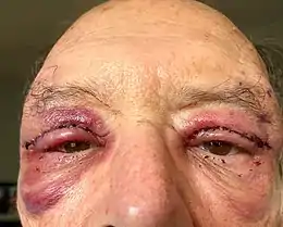 A blepharoplasty operation usually requires 1–3 hours to complete. Post-operatively, swelling and bruising is expected and will usually resolve without further intervention, although application of cold compresses can help to reduce the duration and discomfort.[12] There are no standardized outcome measures for upper or lower blepharoplasty.[12] Blepharoplasty is generally a relatively safe surgery, but possible complications include hematoma/ecchymosis, lagophthalmos (incomplete or abnormal closure of the eyelids), ptosis (drooping of the upper eyelid), scarring, dry eyes, orbital hematoma/compartment syndrome, lymphedema, and ocular motility disorders.[13]