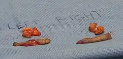 - The fat is held with forceps (left), and clamped with a hemostat (right), while a small medical retractor keeps away the extra tissue, so that the surgeon can operate (bottom right).