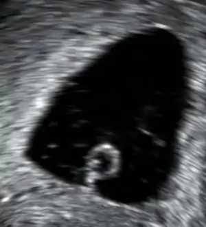A blighted ovum or anembryonic gestation is characterized by a normal-appearing gestational sac, but the absence of an embryo.[2] It likely occurs as a result of early embryonic death with continued development of the trophoblast. When small, the sac cannot be distinguished from the early normal pregnancy, as there may be a yolk sac, though a fetal pole is not seen. In anembryonic pregnancy, levels of the pregnancy hormone human chorionic gonadotropin (hCG) typically rise for a time, which can cause positive pregnancy test results and pregnancy symptoms such as tender breasts.[2][7] Because of the presence of hCG, an ultrasound is typically necessary to diagnose an anembryonic pregnancy.[3] For diagnosis, the sac must be of sufficient size that the absence of normal embryonic elements is established. The criteria depends on the type of ultrasound exam performed. A transvaginal ultrasound provides a better view of early pregnancy than a transabdominal ultrasound.[8] Generally, a transvaginal ultrasound is used to investigate a suspected case of blighted ovum.[2][7] A pregnancy is anembryonic if a transvaginal ultrasound reveals a sac with a mean gestational sac diameter (MGD) greater than 25 mm and no yolk sac, or an MGD >25 mm with no embryo.[9] A transabdominal ultrasound can be used to diagnose anembryonic pregnancy if a gestational sac can be identified, but is empty.[3] An anembryonic pregnancy is never viable, as in viable pregnancy the embryo must form with the gestational sac.[2]