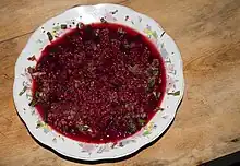Blood as food is the usage of blood in food, religiously and culturally. Many cultures consume blood, often in combination with meat. The blood may be in the form of blood sausage, as a thickener for sauces, a cured salted form for times of food scarcity, or in a blood soup.[1] This is a product from domesticated animals, obtained at a place and time where the blood can run into a container and be swiftly consumed or processed. In many cultures, the animal is slaughtered. In some cultures, blood is a taboo food.