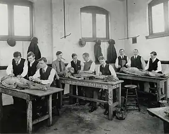 Dissection class at the Philadelphia College of Osteopathic Medicine, 1908. On the center table is written: "He lived for others, He died for us."