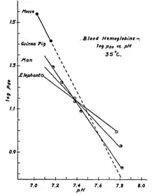 An exception to the otherwise well-supported link between animal body size and the sensitivity of its haemoglobin to changes in pH was discovered in 1961.[12] Based on their size and weight, many marine mammals were hypothesized to have a very low, almost negligible Bohr effect.[9] However, when their blood was examined, this was not the case. Humpback whales weighing 41,000 kilograms had an observed value of 0.82, which is roughly equivalent to the Bohr effect magnitude in a 0.57 kg guinea pig.[9] This extremely strong Bohr effect is hypothesized to be one of marine mammals' many adaptations for deep, long dives, as it allows for virtually all of the bound oxygen on haemoglobin to dissociate and supply the whale's body while it is underwater.[12] Examination of other marine mammal species supports this. In pilot whales and porpoises, which are primarily surface feeders and seldom dive for more than a few minutes, the was 0.52, comparable to a cow,[9] which is much closer to the expected Bohr effect magnitude for animals of their size.[12]