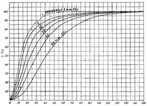 In the early 1900s, Christian Bohr was a professor at the University of Copenhagen in Denmark, already well known for his work in the field of respiratory physiology.[3] He had spent the last two decades studying the solubility of oxygen, carbon dioxide, and other gases in various liquids,[4] and had conducted extensive research on haemoglobin and its affinity for oxygen.[3] In 1903, he began working closely with Karl Hasselbalch and August Krogh, two of his associates at the university, in an attempt to experimentally replicate the work of Gustav von Hüfner, using whole blood instead of haemoglobin solution.[1] Hüfner had suggested that the oxygen-haemoglobin binding curve was hyperbolic in shape,[5] but after extensive experimentation, the Copenhagen group determined that the curve was in fact sigmoidal. Furthermore, in the process of plotting out numerous dissociation curves, it soon became apparent that high partial pressures of carbon dioxide caused the curves to shift to the right.[4] Further experimentation while varying the CO2 concentration quickly provided conclusive evidence, confirming the existence of what would soon become known as the Bohr effect.[1]