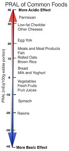 - 1 2 Remer, T; Manz, F (July 1995). "Potential renal acid load of foods and its influence on urine pH". Journal of the American Dietetic Association. 95 (7): 791–97. doi:10.1016/S0002-8223(95)00219-7. PMID 7797810.