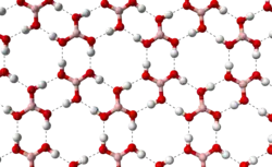 The triclinic form of boric acid consists of layers of B(OH)3 molecules held together by hydrogen bonds with an O...O separation of 272 pm. The distance between two adjacent layers is 318 pm.[7]