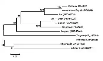 - ↑ Briese, Thomas; Chowdhary, Rashmi; Travassos da Rosa, Amelia; Hutchison, Stephen K.; Popov, Vsevolod; Street, Craig; Tesh, Robert B.; Lipkin, W. Ian (2014). "Upolu virus and Aransas Bay virus, Two Presumptive Bunyaviruses, Are Novel Members of the Family Orthomyxoviridae". Journal of Virology. 88 (10): 5298–309. doi:10.1128/JVI.03391-13. PMC 4019087. PMID 24574415.