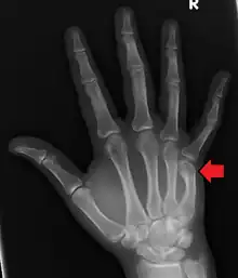A boxer's fracture is the break of the metacarpal bone of the hand near the knuckle at the base of the little finger.[2] Occasionally it is used to refer to fractures of the 4th metacarpal as well.[1] Symptoms include pain and a depressed knuckle.[3]