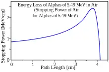 When a fast charged particle moves through matter, it ionizes atoms of the material and deposits a dose along its path. A peak occurs because the interaction cross section increases as the charged particle's energy decreases. Energy lost by charged particles is inversely proportional to the square of their velocity, which explains the peak occurring just before the particle comes to a complete stop.[2] In the upper figure, it is the peak for alpha particles of 5.49 MeV moving through air. In the lower figure, it is the narrow peak of the "native" proton beam curve which is produced by a particle accelerator of 250 MeV. The figure also shows the absorption of a beam of energetic photons (X-rays) which is entirely different in nature; the curve is mainly exponential.
