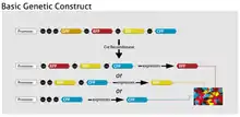 Brainbow-1 uses DNA constructs with different fluorescent protein genes (XFPs) separated by mutant and canonical forms of loxP. This creates a set of mutually exclusive excision possibilities, since cre-mediated recombination occurs only between identical loxP sites.[1] After recombination occurs, the fluorescent protein that is left directly after the promoter is uniquely expressed. Thus, a construct with four XFPs separated by three different loxP sites, three excision events, and the original construct can produce four different fluorescent proteins.[4]