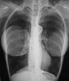 Breast Implant: the chest X-ray of a woman with bilaterally emplaced breast implants shows that the prostheses are radiographically opaque, and are foreign objects in her body, but not of her body.