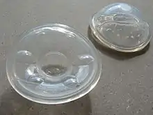 Breast shells are hollow, lightweight plastic disks worn inside the brassiere to help correct flat or inverted nipples either in preparation for or during breastfeeding. Also known as milk cups, breast cups, breast shields, or Woolwich shields, they can also be used to ease sensitive nipples or collect milk when the baby has not finished the teat.[1] Breast shells function by applying gentle but firm pressure to the region surrounding the nipple to stretch underlying adhesions and draw out the nipple.[2] Nipple shields may be confused with breast shells, but shields are intended for use during the act of breastfeeding, whereas breast shells are worn in preparation for or after breastfeeding.