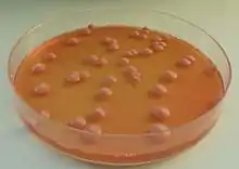 Colonies of yeast Brettanomyces bruxellensis on agar plates containing phloxine B. | |