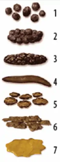 Types 1 and 2 indicate constipation, with 3 and 4 being the ideal stools as they are easy to defecate while not containing excess liquid, and 6 and 7 indicate diarrhoea.[13]
