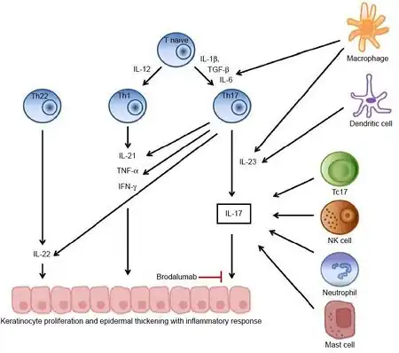 - ↑ Roman, Michael; Chiu, Melvin W. (7 July 2017). "Spotlight on brodalumab in the treatment of moderate-to-severe plaque psoriasis: design, development, and potential place in therapy". Drug Design, Development and Therapy. 11: 2065–2075. doi:10.2147/DDDT.S113683.
