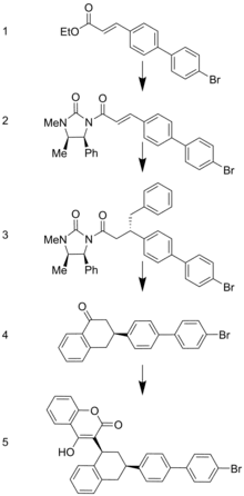 Brodifacoum is a derivative of the 4-hydroxy-coumarin group. Compounds numbers are found next to their respective compounds in the image below. Compound 1 is the starting ester needed to synthesize brodifacoum. To obtain this starting Compound 1, a simple Wittig condensation of ethyl chloroacetate with 4’-bromobiphenylcarboxaldehyde is accomplished. Compound 1 is transformed into Compound 2 by consecutive hydrolysis, halogenation to form an acid chloride, and then reacted with the required lithium anion. This is done using KOH and EtOH for hydrolysis, and then adding SOCl2 for chlorination to form the acid chloride which reacts with the addition of lithium anion. Compound 2 is then transformed using organocopper chemistry to yield Compound 3 with good stereoselectivity of about 98%. Typically, a Friedel-Crafts type cyclization would then be used to obtain the two-ring system portion of Compound 4, but this results in low yield. Instead, trifluoromethanesulfonic acid in dry benzene catalyzes the cyclization with good yield. The ketone is then reduced with sodium borohydride yielding a benzyl alcohol. Condensation with 4-hydroxycoumarin under HCl yields Compound 5, brodifacoum.[4]