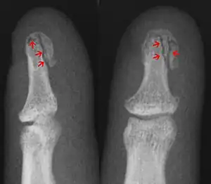 The cause is usually a traumatic injury, such as a direct blow, crush, or cut.[1][3] This may occur during a fall or sports injury.[3] Pathological fractures, from an infection or a tumor, are less common.[3] Diagnosis is generally based on X-rays.[3] Examination should include looking for overlap between fingers.[3]