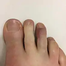 A broken toe is a type of bone fracture.[4] Symptoms include pain when the toe is touched near the break point, or compressed along its length.[2] There may be bruising, swelling, stiffness, or displacement of the broken bone ends from their normal position.[3]