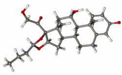 Budesonide, also known as 11β,21-dihydroxy-16α,17α-(butylidenebis(oxy))pregna-1,4-diene-3,20-dione, is a synthetic pregnane steroid and non-halogenated cyclic ketal corticosteroid.[36][37] It is the C16α hydroxyl, C16α,17α cyclic ketal with butyraldehyde derivative of prednisolone (11β,17α,21-trihydroxypregna-1,4-diene-3,20-dione).[36][37]