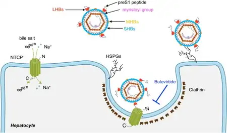 The hepatitis B virus uses its surface lipopeptide pre-S1 for docking to mature liver cells via their sodium/bile acid cotransporter (NTCP) and subsequently entering the cells. Myrcludex B is a synthetic N-acylated pre-S1[7][8] that can also dock to NTCP, blocking the virus's entry mechanism.[9]