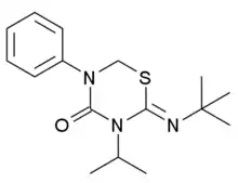 Buprofezin is an insecticide used for control of insect pests such as mealybugs, leafhoppers and whitefly on vegetable crops. It is a growth regulator, acting as an inhibitor of chitin synthesis.[2] It is banned in some countries due to its negative environmental impacts, being especially toxic to aquatic organisms as well as non-target insects, though is of low toxicity to humans and other mammals.[3]