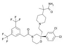 - ↑ Emonds-Alt X, Proietto V, Steinberg R, Oury-Donat F, Vigé X, Vilain P, et al. (December 2002). "SSR240600 [(R)-2-(1-[2-[4-[2-[3,5-bis(trifluoromethyl)phenyl]acetyl]-2-(3,4-dichlorophenyl)-2-morpholinyl]ethyl]- 4-piperidinyl)-2-methylpropanamide], a centrally active nonpeptide antagonist of the tachykinin neurokinin-1 receptor: I. biochemical and pharmacological characterization". The Journal of Pharmacology and Experimental Therapeutics. 303 (3): 1171–9. doi:10.1124/jpet.102.040162. PMID 12438541. S2CID 1467606.