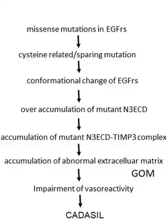 - ↑ Ueda M, Nakaguma R, Ando Y (March 2009). "[Cerebral autosomal dominant arteriopathy with subcortical infarcts and leukoencephalopathy (CADASIL)]". Rinsho Byori (in Japanese). 57 (3): 242–51. PMID 19363995.