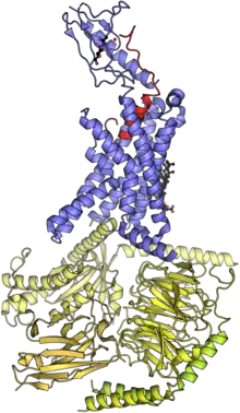 Structure of the human calcitonin recptor-Gs complex. The calcitonin transmembrane receptor (blue) is bound to human calcitonin (red) and the Gs complex (yellow). PDB: 7TYO