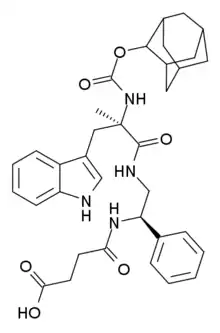 CI-988 (PD-134,308) is a drug which acts as a cholecystokinin antagonist, selective for the CCKB subtype. In animal studies it showed anxiolytic effects[1][2] and potentiated the analgesic action of both morphine[3] and endogenous opioid peptides,[4][5] as well as preventing the development of tolerance to opioids[6][7] and reducing symptoms of withdrawal.[8][9] Consequently, it was hoped that it might have clinical applications for the treatment of pain and anxiety in humans, but trial results were disappointing with only minimal therapeutic effects observed even at high doses.[10][11][12][13] The reason for the failure of CI-988 and other CCKB antagonists in humans despite their apparent promise in pre-clinical animal studies is unclear, although poor pharmacokinetic properties of the currently available drugs are a possible explanation,[14] and CCKB antagonists are still being researched for possible uses as adjuvants to boost the activity of other drugs.[15]