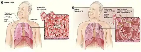 Chronic obstructive pulmonary disease (COPD) is a type of obstructive lung disease characterized by long-term breathing problems and poor airflow.[1][8] The main symptoms include shortness of breath and cough with sputum production.[1] COPD is a progressive disease, meaning it typically worsens over time.[9] Eventually, everyday activities such as walking or getting dressed become difficult.[3] Chronic bronchitis and emphysema are older terms used for different types of COPD.[10][11][12] The term "chronic bronchitis" is still used to define a productive cough that is present for at least three months each year for two years.[1] Those with such a cough are at a greater risk of developing COPD.[13] The term "emphysema" is also used for the abnormal presence of air or other gas within tissues.[14]