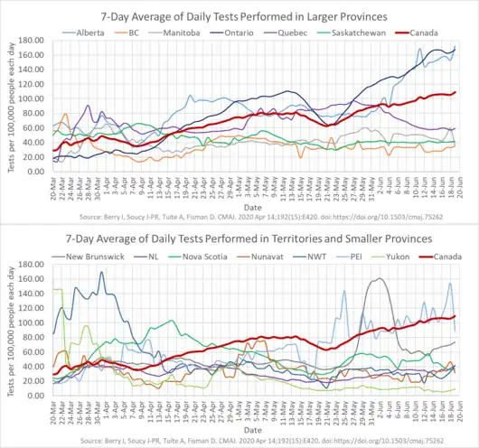 252. Berry, Isha; Soucy, Jean-Paul R.; Tuite, Ashleigh; Fisman, David (April 14, 2020). "Open access epidemiologic data and an interactive dashboard to monitor the COVID-19 outbreak in Canada". CMAJ. 192 (15): E420. doi:10.1503/cmaj.75262. ISSN 0820-3946. PMC 7162433. PMID 32392510.