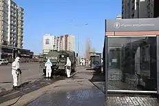 On 13 March 2020, two Kazakh citizens in Almaty who had recently returned from Germany were confirmed to be infected with COVID-19.[17] Just two days later on 15 March, President Kassym-Jomart Tokayev introduced a state of emergency throughout Kazakhstan from 16 March 2020 to 15 April 2020.[18] As a result, the protection of public order and especially important state and strategic facilities were strengthened, operations of shopping centers, cinemas and exhibitions were suspended, as well as mass gatherings, including family, memorial and sports were prohibited.[19]