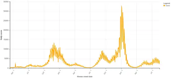 As of August 1, a total of 1,130,134 cases had been reported leading to 61,939 hospitalizations.[90] As of August 12, a total of 1,152,590 cases had been reported.[91] As of August 20, a total of 1,175,340 cases has been reported.[92] By August 27, the number of cases surpassed 1.2 million.[93]