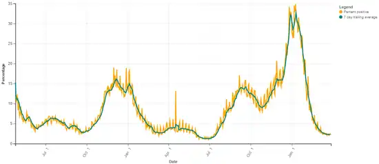 On October 31, the 7-day test positivity rate was 6.9%.[45] Two restaurants in Cleveland were cited for violating health orders with large Halloween gatherings.[46]