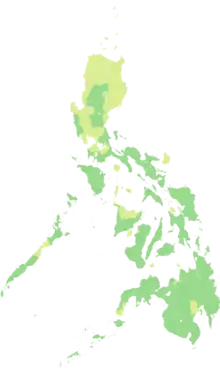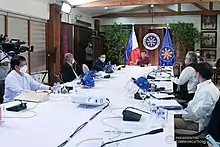 After over a month without recording any cases, the Philippines confirmed its first local transmission on March 7, 2020.[9][10] Since then, the virus has spread to the country's 81 provinces.[11] National and local governments have been imposing community quarantines since March 15, 2020, as a measure to limit the spread of the virus.[12] These include the Luzon-wide enhanced community quarantine (ECQ) that was implemented in March–May 2020.[lower-alpha 2][13] On March 24, President Rodrigo Duterte signed the Bayanihan to Heal as One Act, a law that granted him additional powers to handle the pandemic. This was repealed by a follow-up law, the Bayanihan to Recover as One Act, which he signed on September 11.[14]