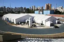 In the city of São Paulo, field hospitals for the exclusive care of people with COVID-19 were built by the municipal and state governments. Hospitals were established at Pacaembu Stadium,[3][4] at the Ibirapuera Gymnasium athletics track[5] and the Anhembi Convention Center.[6]