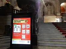 On 16 April, Switzerland announced that the country would ease restrictions in a three-step, gradual way. The first step began on 27 April, for those who work in close contact with others, but not in large numbers.[54] Surgeons, dentists, day care workers, hairdressers, massage and beauty salons could be opened with safety procedures applied. DIY stores, garden centres, florists and food shops that also sell other goods could also be opened. The second step was to begin on 11 May, assuming implementation of the first step without problems, at which time other shops and schools could be opened. The third step would begin on 8 June with the easing of restrictions on vocational schools, universities, museums, zoos and libraries.[54] From the 25 June onwards, the Government pays for the costs of an eventual Covid Test, if a patient has enough symptoms of COVID-19.[55] In July and August, masks became mandatory, first on public transport and then also in airplanes.[55]