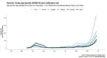 The Czech Republic was the first[12] European country to make the wearing of face masks mandatory from 19 March onwards.[13] COVID-19 testing was made widely available with drive-through locations from 14 March,[14] and from 27 March anyone with a fever, dry cough or shortness of breath was eligible for a free test.[15] From 13 April onwards, COVID-19 testing capacity significantly surpassed demand.[16] Contact tracing in the country also included voluntary disclosure of mobile phone position and debit card payments data for previous days and the quarantining of identified contacts.[17] By 1 May 2020, altogether 257 COVID-19-related deaths were identified in the Czech Republic compared to 2,719 in similarly populous Sweden, which did not impose a full lockdown. However, Belgium, also with a similar population, had had 7,866 deaths at that time, despite having implemented an early and strict lockdown. The Czech Republic started gradually easing measures from 7 April 2020 onwards,[5][18] with most restrictions being lifted by 11 May 2020. However, by 17 November 2020, the Czech Republic had recorded a total of 6,416 COVID-19-related deaths compared to 6,344 in Sweden, surpassing Sweden's deaths count. By August 2021, the Czech Republic has recorded the fourth highest confirmed death rate in the world. There are some root causes speculated. A lockdown was decided in November 2020.
