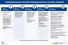 Some measures undertaken by the Czech Republic differed in key aspects from other countries. A general curfew was in place between 16 March and 24 April, although with numerous exemptions. Apart from permitting essential shopping and going to and from work, as in other countries, it also permitted visiting relatives and allowed for unrestricted movement in parks and open countryside.[7] A general closure of services and retail sales was in place from 14 March until 11 May; however, all shops could conduct socially distant sales with delivery through makeshift takeout windows and the gradual opening of selected shops started in several waves from 24 March onwards.[8] Fear, anger, and hopelessness were the most frequent traumatic emotional responses in the general public during the first COVID-19 outbreak in the Czech Republic.[9] The four most frequent categories of fear were determined: fear of the negative impact on household finances, fear of the negative impact on the household finances of significant others, fear of the unavailability of health care, and fear of an insufficient food supply.[9] The government did not order the closure of manufacturing plants, but many did so voluntarily during the second half of March, with Hyundai spearheading a gradual reopening from 14 April.[10][11]