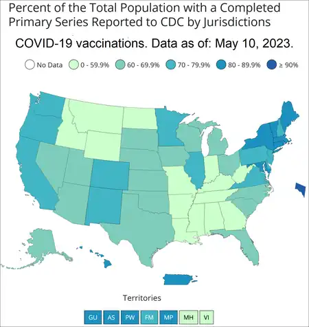 State and local responses to the pandemic during the public health emergency included the requirement to wear a face mask in specified situations (mask mandates), prohibition and cancellation of large-scale gatherings (including festivals and sporting events), stay-at-home orders, and school closures.[31] Disproportionate numbers of cases have been observed among Black and Latino populations,[32][33][34] as well as elevated levels of vaccine hesitancy,[35][36] and there was a sharp increase in reported incidents of xenophobia and racism against Asian Americans.[37][38] Clusters of infections and deaths have occurred in many areas.[lower-alpha 2] The COVID-19 pandemic also led to misinformation and conspiracy theories[41] and highlighted weaknesses in the U.S. public health system.[22][42][43]