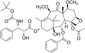 - ↑ Mita AC, Denis LJ, Rowinsky EK, Debono JS, Goetz AD, Ochoa L, et al. (January 2009). "Phase I and pharmacokinetic study of XRP6258 (RPR 116258A), a novel taxane, administered as a 1-hour infusion every 3 weeks in patients with advanced solid tumors". Clinical Cancer Research. 15 (2): 723–30. doi:10.1158/1078-0432.CCR-08-0596. PMID 19147780.