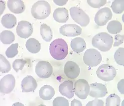 Cabot rings are thin, red-violet staining, threadlike strands in the shape of a loop or figure-8 that are found on rare occasions in red blood cells (erythrocytes). They are believed to be microtubules that are remnants from a mitotic spindle, and their presence indicates an abnormality in the production of red blood cells.[1] Cabot Rings, considerably rare findings, when present are found in the cytoplasm of red blood cells and in most cases, are caused by defects of erythrocytic production[2] and are not commonly found in the blood circulating throughout the body.[3]