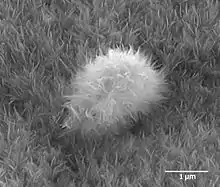 Needle-like hydroxyapatite crystals on stainless steel. Scanning electron microscope picture from University of Tartu.